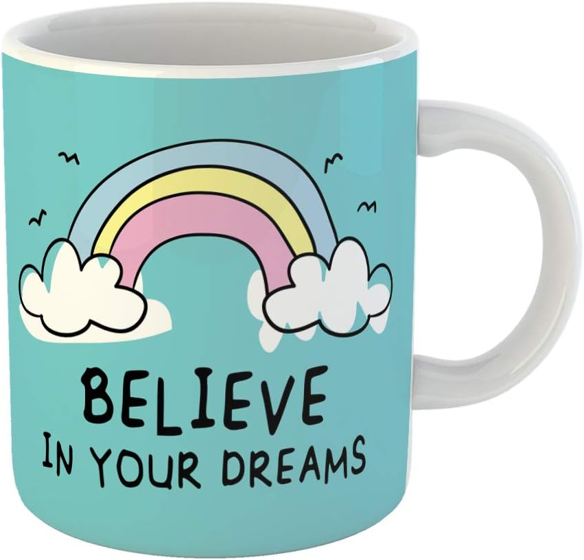 Amazon Com Emvency 11 Ounces Coffee Mug Blue Kids Believe In Your Dreams Inspirational Quote And Cute Rainbow Drawing Graphic Colorful Text White Ceramic Glossy Tea Cup With Large C Handle Kitchen Dining