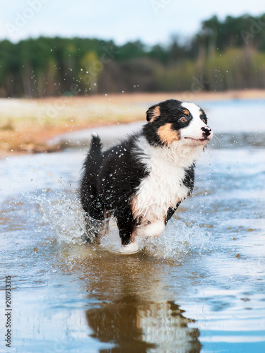 Happy Dog Runs Along The Beach In A Spray Of Water Beautiful Australian Shepherd Puppy 3 Months Old Running Towards Camera Cute Dog Enjoy Playing On Beach Buy This Stock Photo