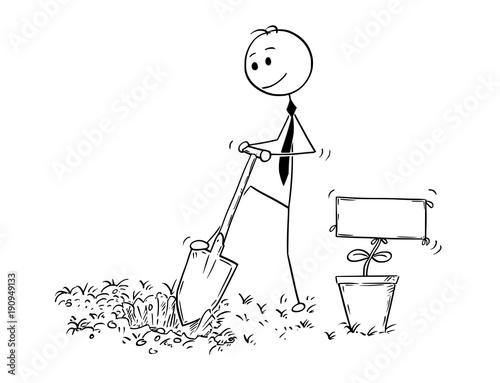 Cartoon Stick Man Drawing Conceptual Illustration Of Businessman Digging Hole To Plant A Tree With Empty Or Blank Sign As Flower Business Concept Of Investment Growth And Success Buy This Stock